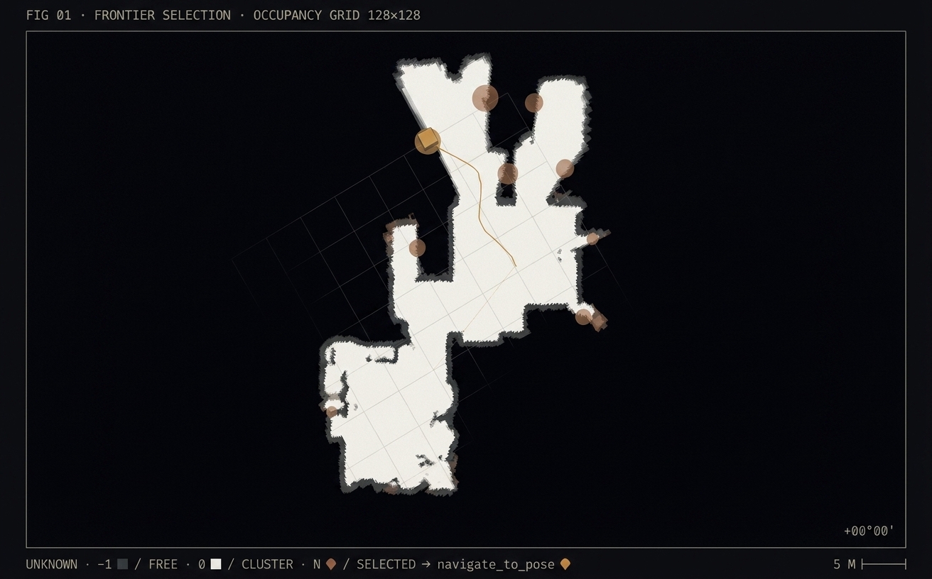 The classical answer is called frontier exploration. The idea is old and good: any border between what the robot has seen and what it hasn’t is a frontier, and the frontier most worth visiting is the one that either (a) is close, (b) points the way the robot is already facing, or (c) is likely to lead somewhere useful. “Likely” is where it gets interesting.